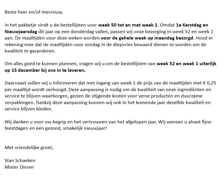 – Bestellingen voor de eerst volgende week uiterlijk donderdag voor 18:00 uur aanleveren.
